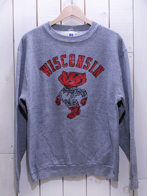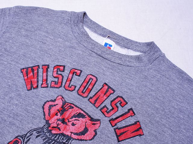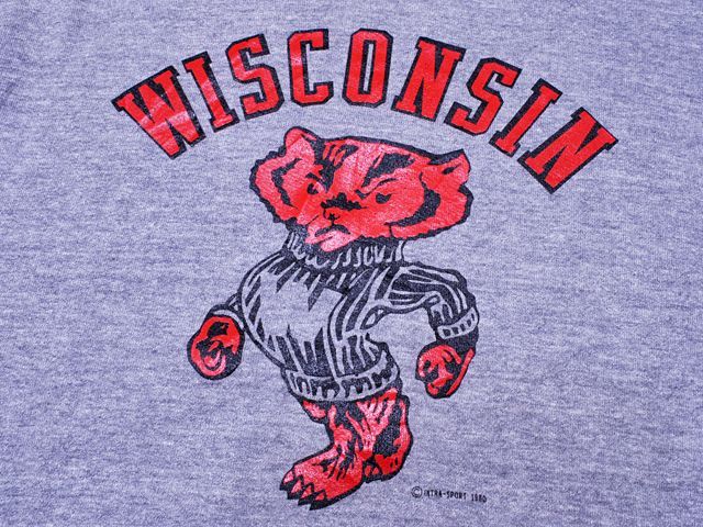人気のカレッジスウェットで中でも人気のあるWISCONSINのバッキーくんのプリントになります。赤黒のラバープリントで杢グレーのボディの風合いも良いです。柔らかくとても着心地の良さそうなボディです。