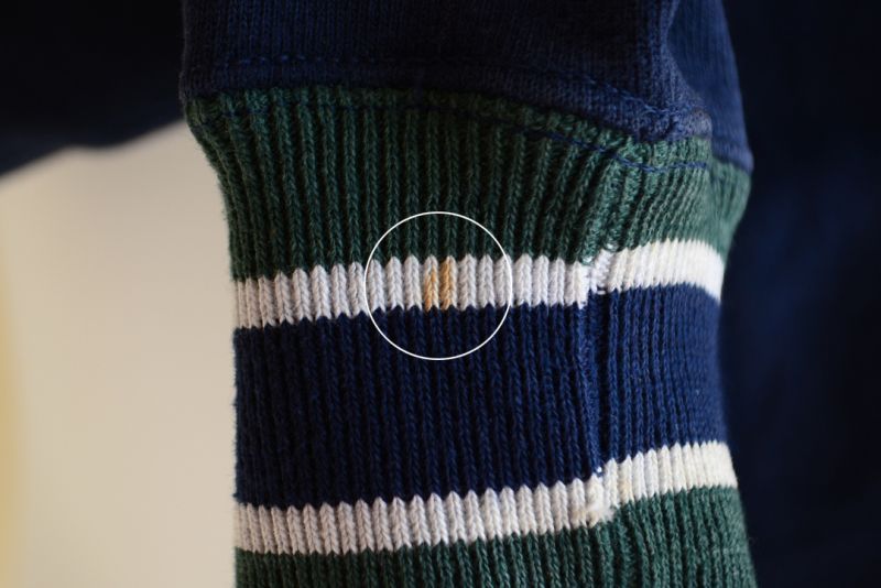 USEDになりますので使用感はございます。ロゴ刺繍に僅かなホツレ、右袖リブに僅かな汚れがございますが、コンディションは良好です。