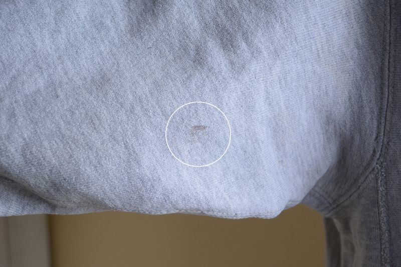 USEDになりますので使用感はございます。首リブや袖リブ・袖リブ付け根・裾リブに少々ダメージ、左袖目玉に少々剥がれ、右袖に僅かな汚れがございますがコンディションはまずまずです。