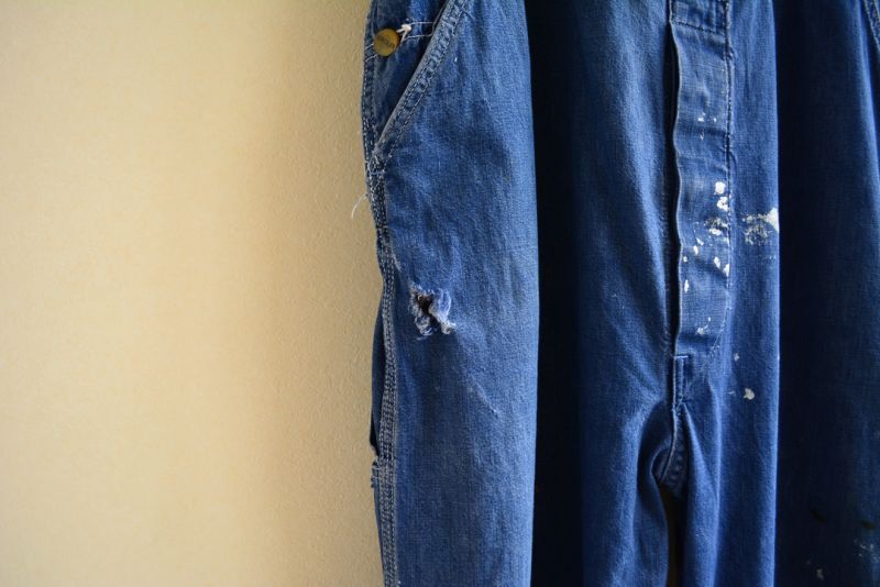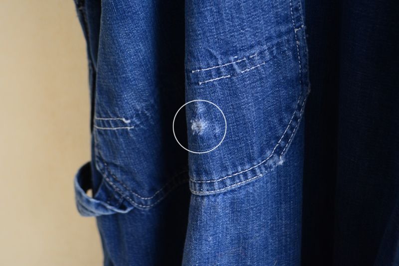 USEDになりますので使用感はございます。フロントに多数の白いペンキ汚れ、左太もも付近にオイル汚れ、ハンマーループ付け根に少々ホツレ、右太ももと右ヒップポケット下付近・左太もも裏側に破れダメージがございますが、まずまずな状態だと思います。