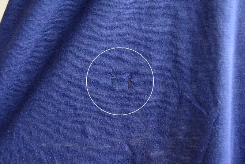 USEDになりますので使用感はございます。綿ポリと言う事もあり生地の透け感がございます。お腹付近に小さなダメージ、それなりに着用されたもの様で生地には張りがありませんがコンディションまずまずです。