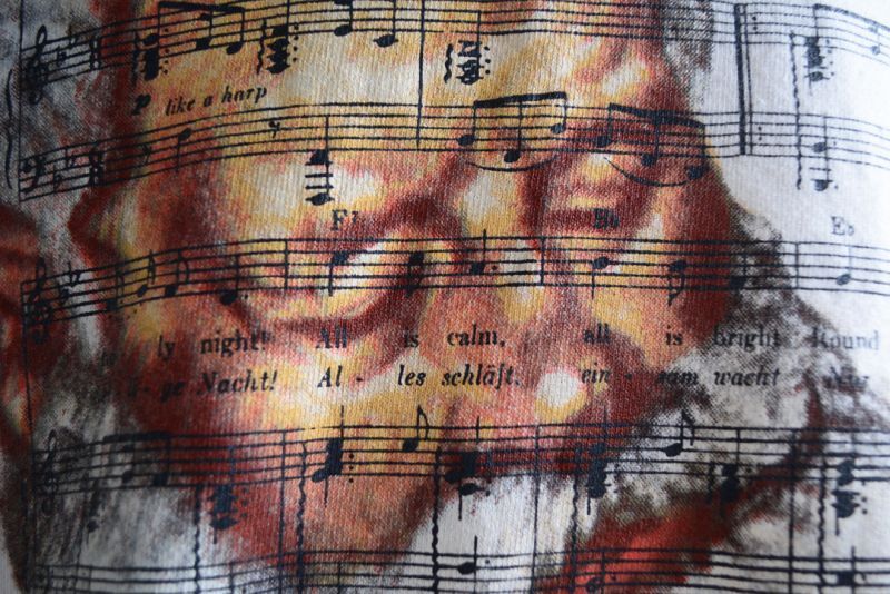 Silent Nightの譜面とサンタがダブルでプリントされた珍しいプリントで大変魅力的です。