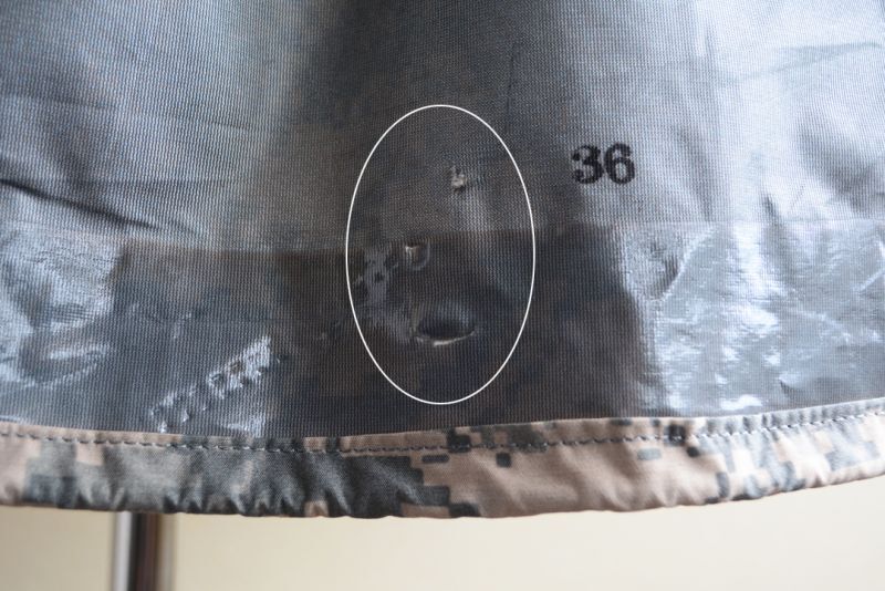USEDになりますので少々使用感はございます。フロント裾に薄っすら黒っぽい汚れ、フロント裾中央より少し左付近にリペアテープによる補修跡が二ヵ所、バック裾裏側に僅かな傷が見られますが、コンディションはまずまず良好です。