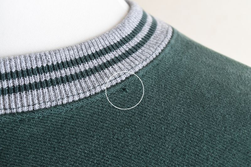 USEDになりますので少々使用感はございます。首リブ付近にピンホール程度の小さなホツレ、右袖リブ付け根に僅かなホツレ、左肘下付近にペンキのような汚れ、左袖付け根付近と袖口付近・お腹付近に小さな汚れが見られますがコンディションはまずまず良好です。