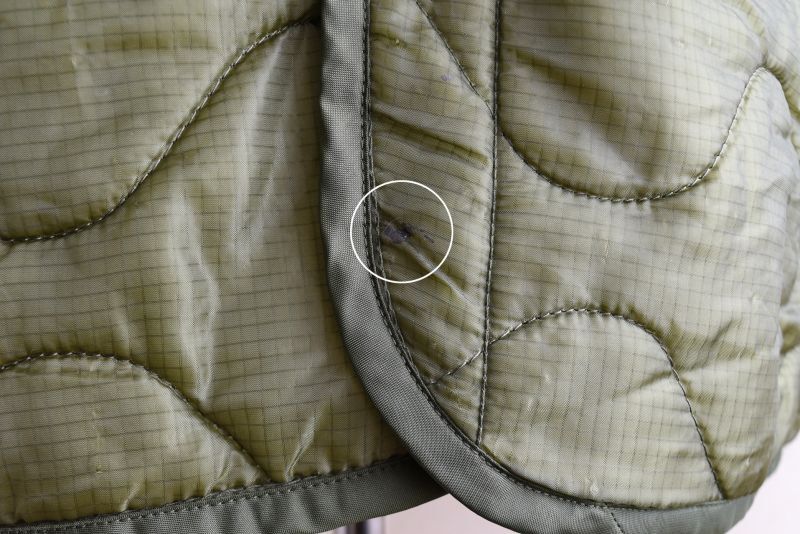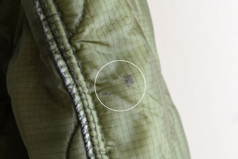 USEDになりますので少々使用感・キルティングに所々ステッチ抜けや小さな引っ掛け傷、左胸下や右袖・フロント裾に小さな黒っぽい汚れ、左袖付け根に小さなダメージが見られますがコンディションはまずまずです。