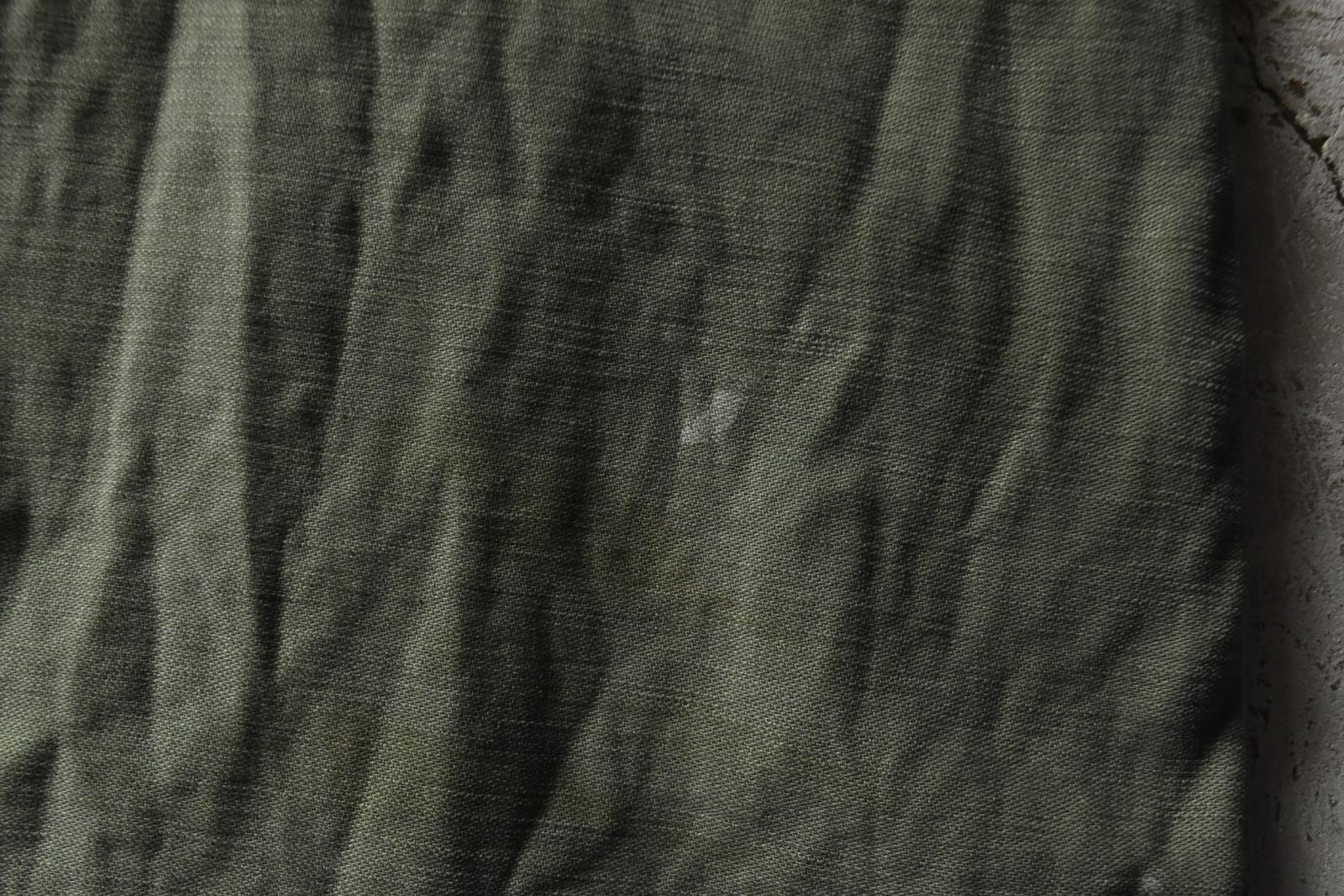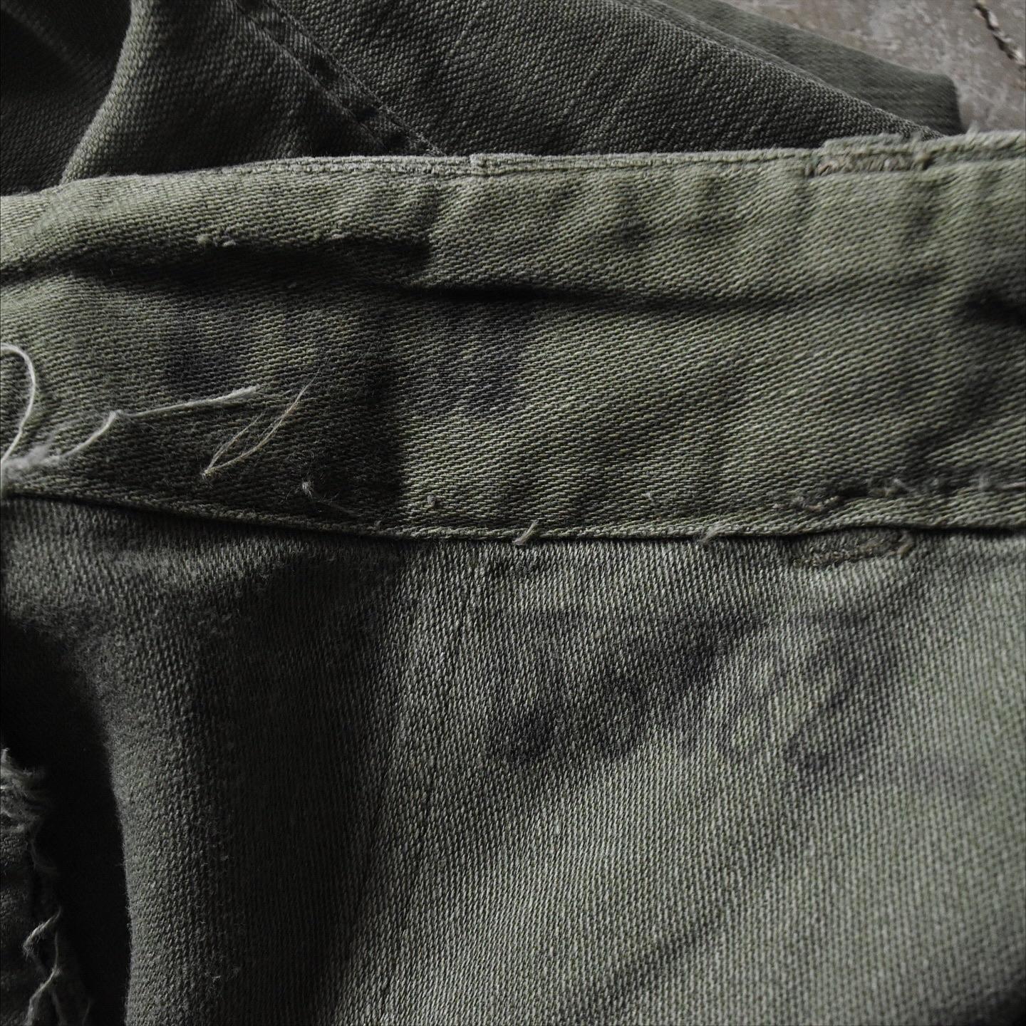 USEDになりますので使用感はございます。全体的に色落ち色褪せの使用感は見られ、フロントボタンフライのボタンひとつに付け替え、フロント両ポケットにダメージと裏面からミシンによるリペア跡、両太ももに小さなダメージと生地が薄くなっている個所あり、両太もも裏付近に少々汚れが見られます。状態は良い方ではありませんが雰囲気は抜群に良いです。