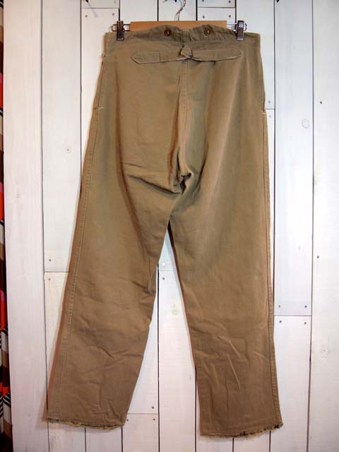 非常に珍しい30年代頃のシンチ付きワークパンツです。年代やワークパンツを言うことを考えてもコンディションは良く、オススメです。ベルトループが付くまえでサスペンダーボタンが付きます。サイズは大き過ぎず、サスペンダーを別で付けなくても下がってこない良いサイズだと思います。