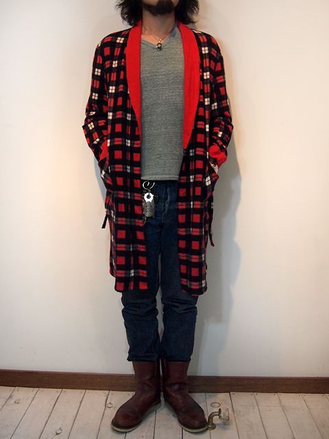 人気のネルガウンです。ビンテージフランネルの素材感がとても良く、襟と袖口が赤で面白いデザインのネルガウンです。