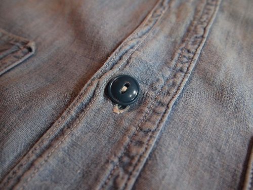 希少な40年代のUS.NAVYシャンブレーです。胸のパッチポケット上にはネームステンシルが入り、マチ付きです。ボタンは生地と同系色のプラスチック製ボタンになります。コンディションは上記の通りですが、年代を考えるとやむを得ないと思います。ヴィンテージの中でも人気の高いミリタリー物ですのでお探しの方もいらっしゃることと思います。