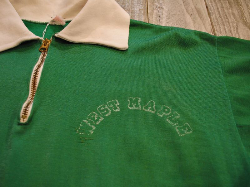 このタイプは好みが分かれるアイテムではございますが、お好きな方にとってはたまらない一枚かと思います。ランナーズタグもしっかりと残る50年代製でボディはレーヨン混紡で襟やリブは綿100%、カラーもグリーン×ホワイトのツートン、ZIPは真鍮製のTALONが付きます。