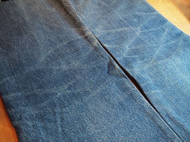 色は濃いめで非常にメリハリのある色落ちです。ウエストヨーク付近にはまだ毛羽立ちが残っております。太腿付近のヒゲはもちろん膝や膝裏の蜂の巣もキレイに出ています。これからの色落ちも楽しみな66後期です。ジャスト穿きがおすすめです。