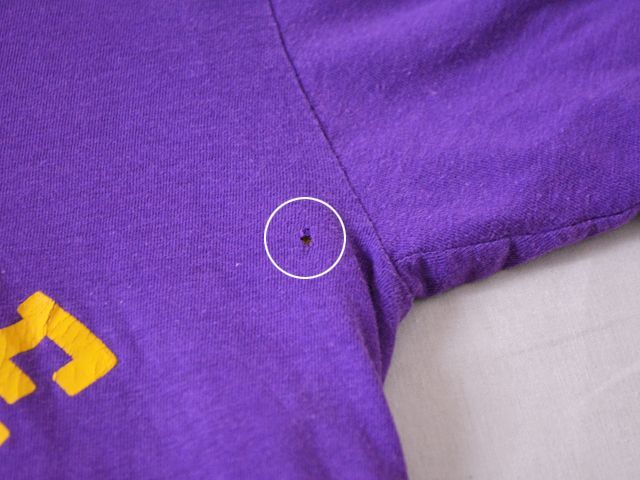 USEDになりますので少々使用感がございます。左脇下付近・右袖・右裾サイド・左脇腹付近・右肩付近に小さなダメージ、ラバープリントに少々ひび割れ、背中に薄らプリント移りのようなものがございますが、コンディションはまずまず良好です。