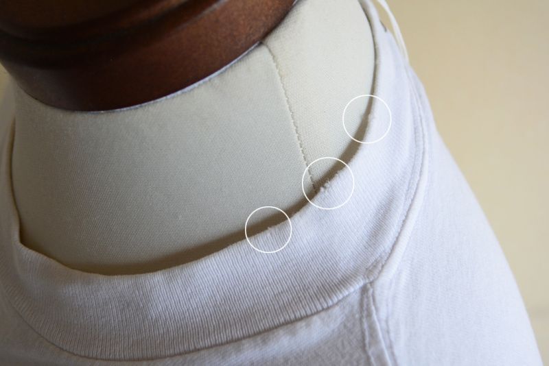 USEDになりますので少々使用感はございます。お腹に薄っすら僅かなシミ、首リブに小さなダメージがございますが、コンディションはまずまず良好です。