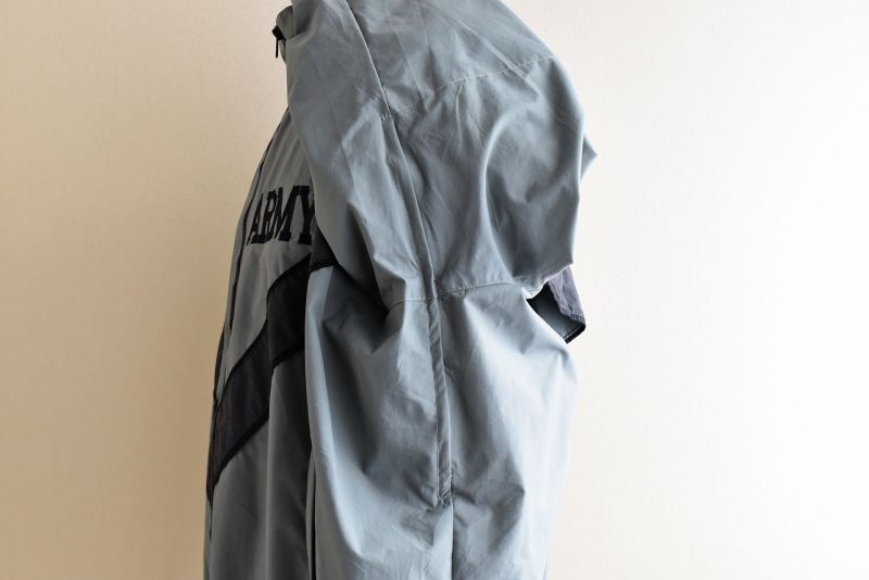 落ち着いたグレーカラーの防水に優れたナイロンシェルに左胸にはARMYの力強い黒刺繍が入り