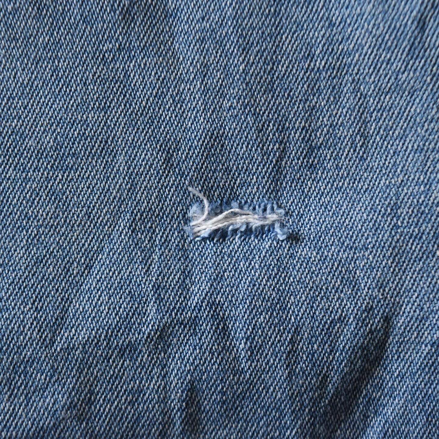 USEDになりますので使用感・デニムの色落ちは見られます。全体的に色味は薄くワイルドに汚れた色落ちになりますが、袖に浮き出るハチノスなど雰囲気は抜群です。汚れの他に背中中央付近にダメージが見られますがコンディションはまずまずです。
