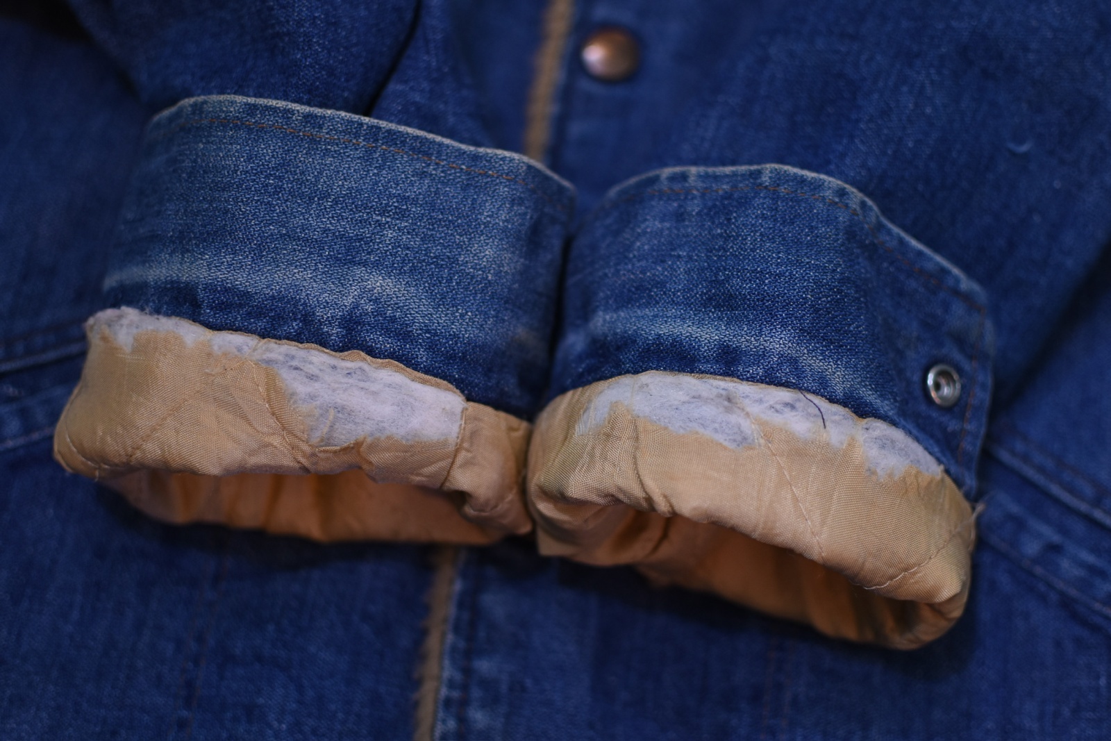 USEDになりますので多少の使用感はございます。右袖に小さなダメージ、両袖口裏地にダメージが見られますがコンディションはまずまず良好です。